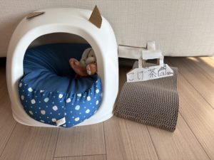 正式譲渡の日。ご自宅に訪問すると、むすめさんは こげちゃのおうちを一生懸命作ってくれていました。
